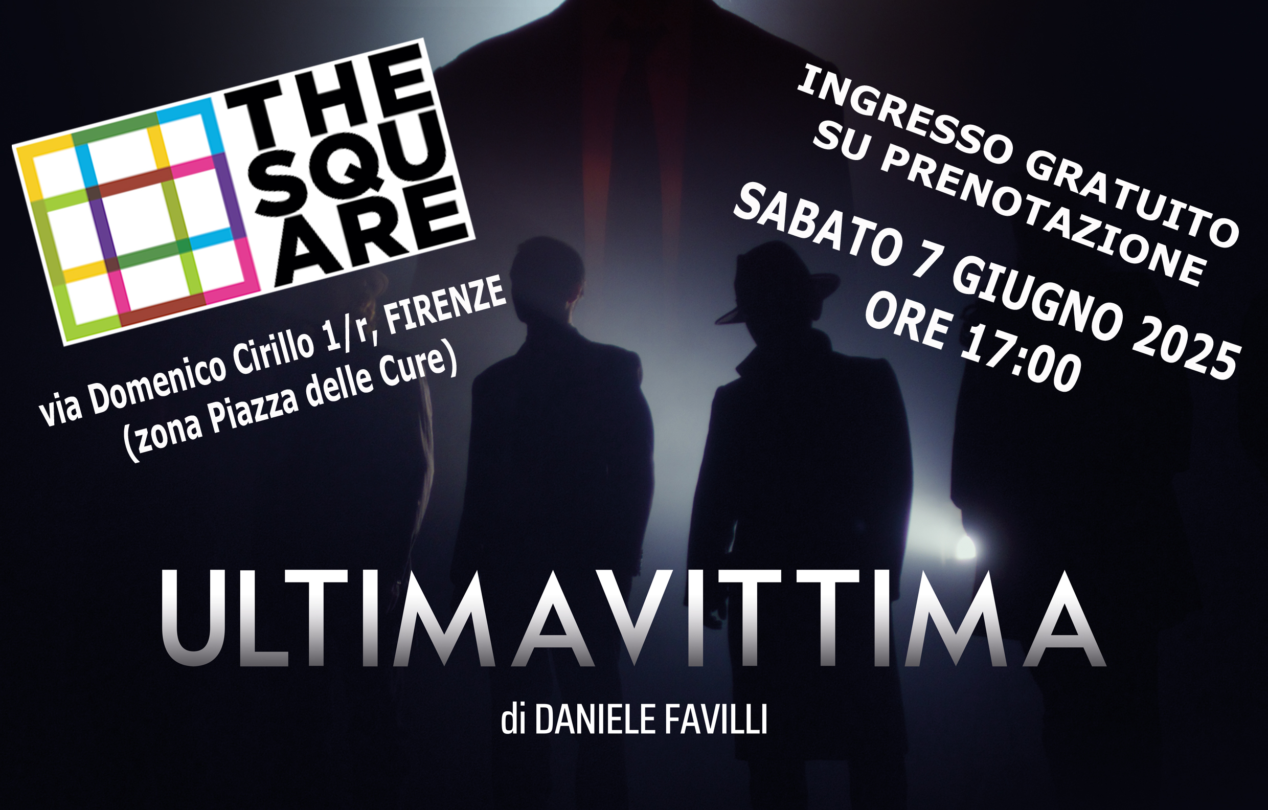 Dopo il grandioso successo all'INDY FILM FEST di Indianapolis, è tempo di festeggiare con una nuova proiezione gratuita su prenotazione per tutte coloro e tutti coloro che avessero piacere di vedere ULTIMA VITTIMA di Daniele Favilli. La proiezione si terrà a THE SQUARE in via Domenico Cirillo 1/r a Firenze (zona Piazza delle Cure) alle ore 17:00. L'INGRESSO è GRATUITO. E' necessario però MANDARE UNA EMAIL a daniele.cosmoglobo@gmail.com indicando il numero di persone da mettere in lista. Il film, nato come puntata pilota del progetto di serie TV "Proiettili